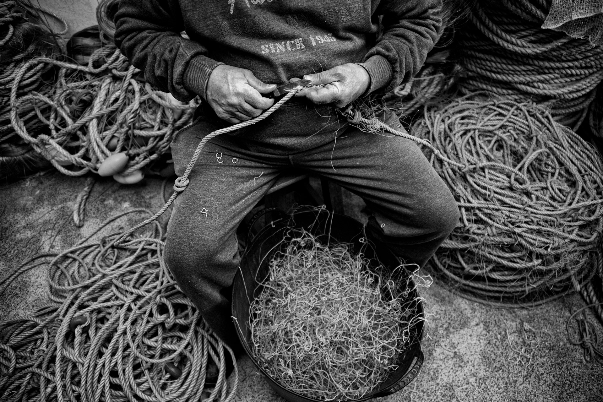Em terra, noutro tipo de trabalho: a reparação de cordas. Caxinas, 01/2017